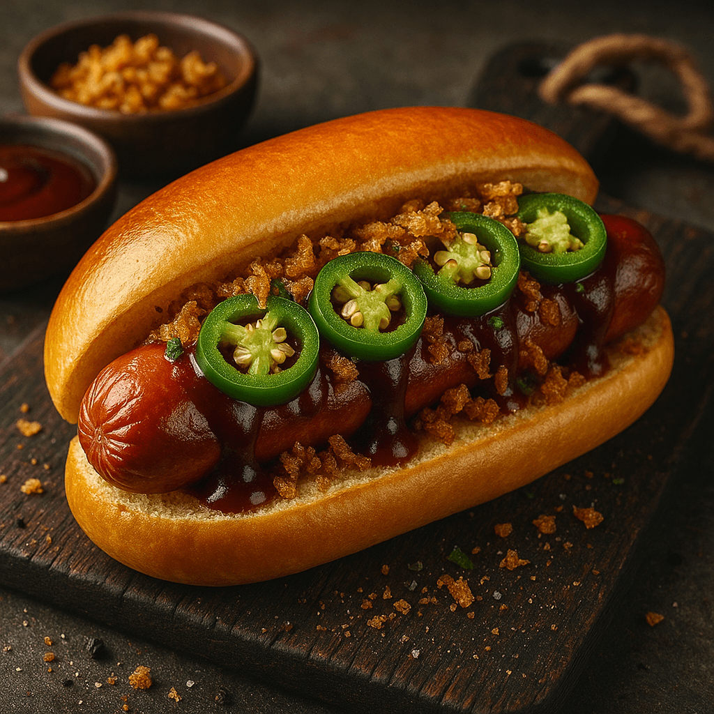 – Brioche bun – Smoked BBQ sauce – Jalapeños – Crispy onions